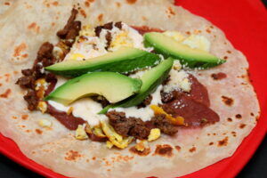 Fresh hand-made flour tortilla filled with refried beans, scrambled egg, avocado, salvadorian cream and queso duro, choice of marinated steak or chicken.